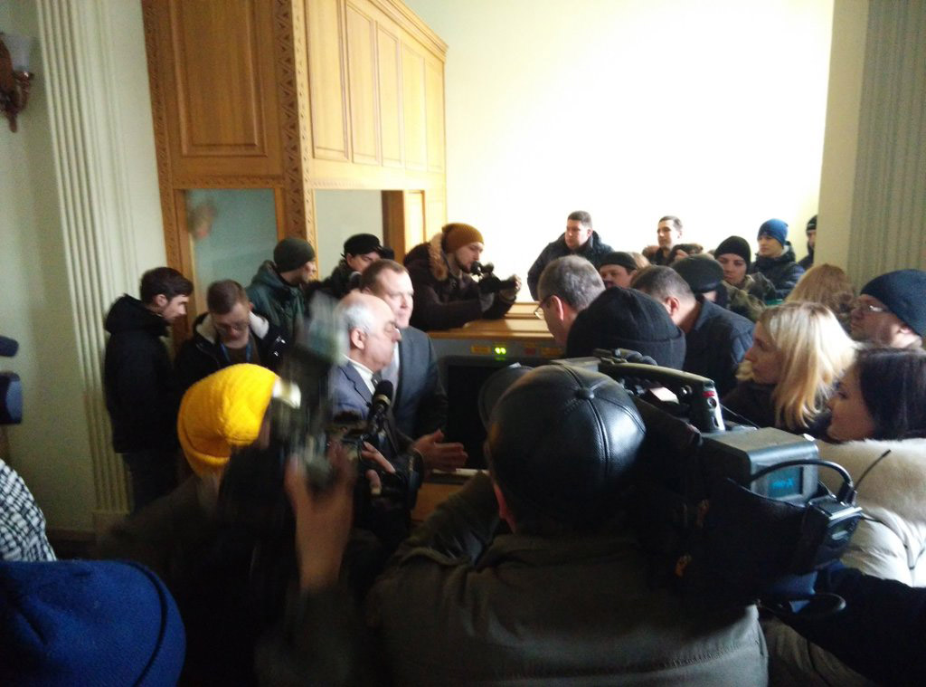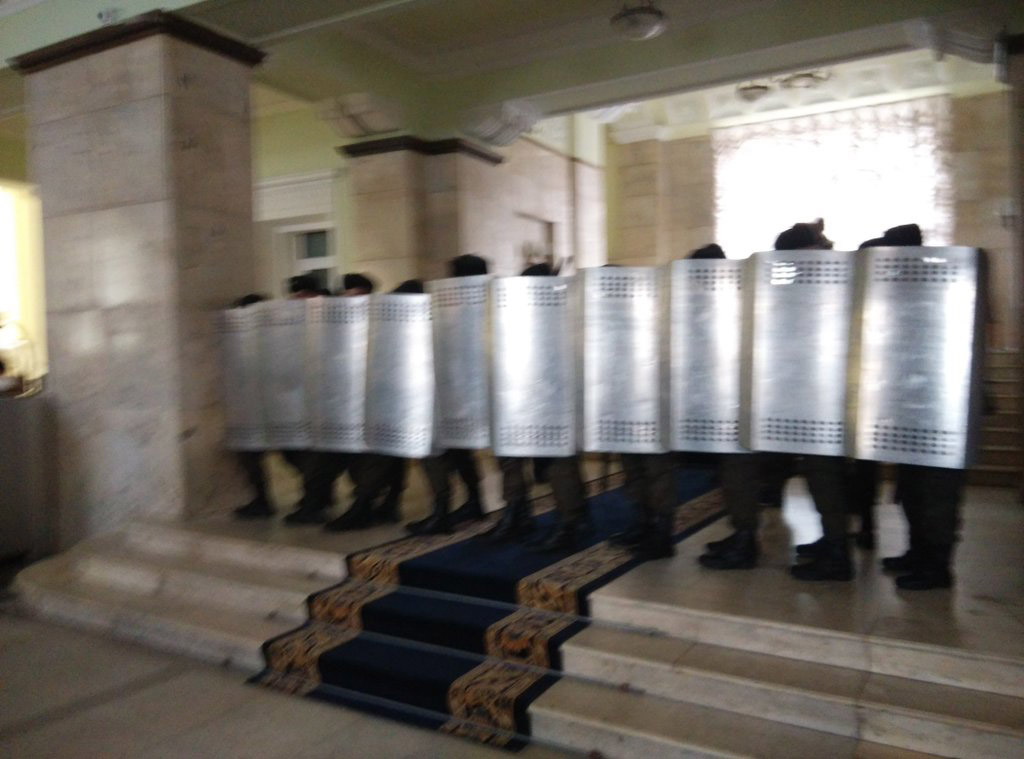 Однако через рамку металлоискателя активистов не пустили. В холл выбежало около десятка нацгвардейцев. Бойцы со щитами заблокировали вход в холл здания.