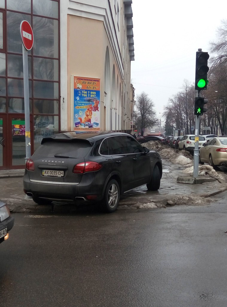 Водитель автомобиля Porshe Cayene с номерами АХ0035СН припарковал машину на тротуаре возле светофора, чем мешает движению пешеходов. Дело происходит на пересечении улиц Скрыпника и Чернышевской в Харькове.