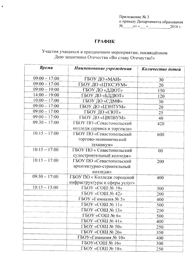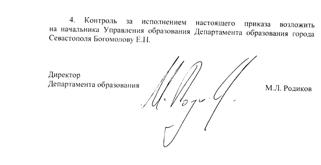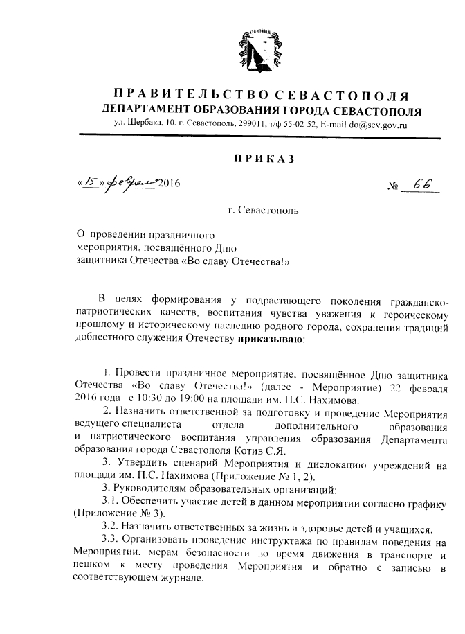 Родиков приказал «в целях формирования у подрастающего поколения гражданско-патриотических качеств, воспитания чувства уважения и историческому наследию родного города, сохранения традиций доблестного служения Отечеству» каждой школе организовать участие детей в неназванном в официальном документе праздничном мероприятии. Десять тысяч школьников планировалось держать 22 февраля на площади Нахимова в течение семи часов (с 10 утра до 17 вечера). По спекциальным квотам для каждого учебного заведения чиновник требовал привести в центр города от 200 до 700 школьников (см. документ).