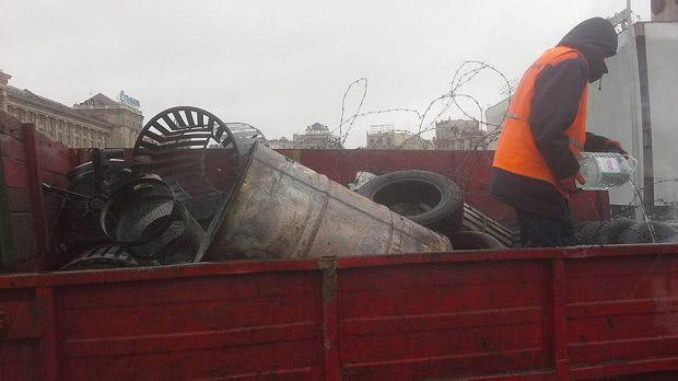 В Киеве на Майдане Независимости работники коммунальных служб вывозят мусор и разбирают "баррикады", установленные активистами, называющими себя "Революционными правыми силами". Об этом сообщает LB.ua.