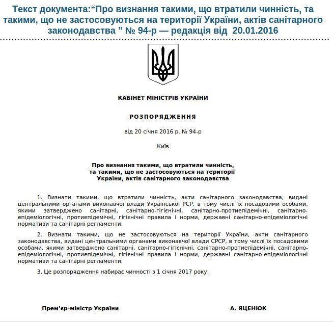 Кабинет Министров Украины признал утратившими силу и такими, что не применяются на территории Украины, акты санитарного законодательства, выданные центральными органами исполнительной власти Украинской ССР, а также центральными органами исполнительной власти СССР.