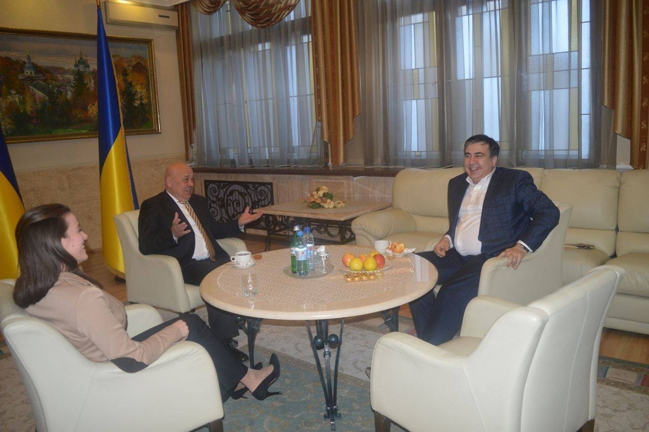 "Встретил сегодня господина Саакашвили в Ужгороде. Очень хорошо пообщались в администрации. Вспомнили общих знакомых в Грузии, поговорили о мнимой децентрализации (ничего Киев на места отдавать не хочет), вспомнили историю (со времен Австро-Венгрии до сегодняшнего дня), поделились опытом борьбы с коррупцией (особенно на таможнях) и даже пошутили о декоммунизации (о переименовании улиц Владимира Ленина на улице Джона Леннона)", - написал Г.Москаль.