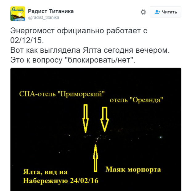"Энергомост официально работает со 2 декабря 2015 года. Вот как выглядела Ялта сегодня вечером. Это к вопросу "блокировать/нет", - подписан снимок, сделанный в промежутке между 19:00 и 20:00 24 февраля.