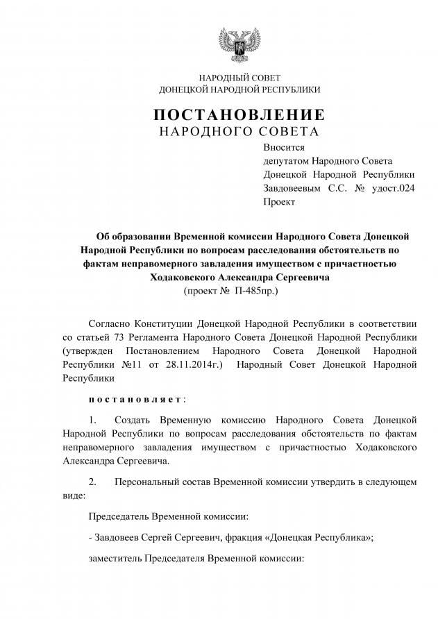 25 февраля стало известно о том, что в «народном совете днр» планируется создание временной комиссии, которая займется расследованием «темных делишек» Ходаковского. А 27-го числа состоялось заседание «народного совета днр», на котором, как сообщил Ходаковский, помимо рассмотрения ряда «законопроектов» было принято «постановление об образовании временной комиссии народного совета днр по вопросам расследования обстоятельств по фактам неправомерного завладения имуществом с причастностью Ходаковского Александра Сергеевича». В состав комиссии вошли «депутаты» из двух «фракций», представленных в «народном совете днр»: общественного движения «Донецкая республика» и общественного движения «Свободный Донбасс». Председателем временной комиссии был назначен Сергей Завдовеев («Донецкая Республика»), заместителем председателя – Евгений Орлов («Свободный Донбасс»).