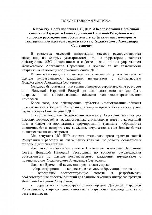 Комиссии среди прочего было поручено установить все факты и обстоятельства неправомерного завладения имуществом с причастностью Александра Ходаковского, для чего ей предоставлено право на обращение в «правоохранительные органы днр для привлечения к ответственности виновных в нарушении законодательства». Срок работы комиссии определен до 30 апреля с.г. В «официальных» СМИ «днр» относительно создания временной комиссии по Ходаковскому ничего не сообщалось.