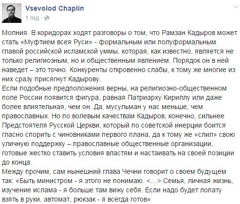Всеволод Чаплин, бывший спикер Русской православной церкви, заявил, что Рамзан Кадыров может стать "Муфтием всея Руси". Об этом он сообщил на своей странице в Facebook, отмечает РБК-Украина.