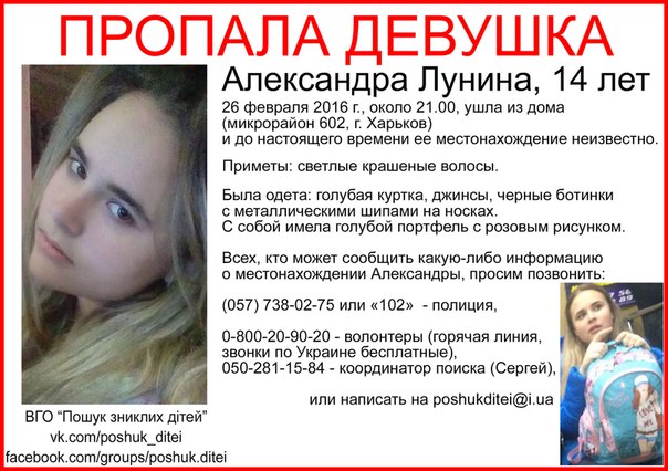 «Всех, кто видел школьницу или знает что-то о ее местонахождении, просят сообщать по следующим номерам: (057) 738-02-75 или 102 (полиция); 0-900-20-90-20 (волонтеры); (050) 281-15-84 (Сергей)», - говорится в сообщении.