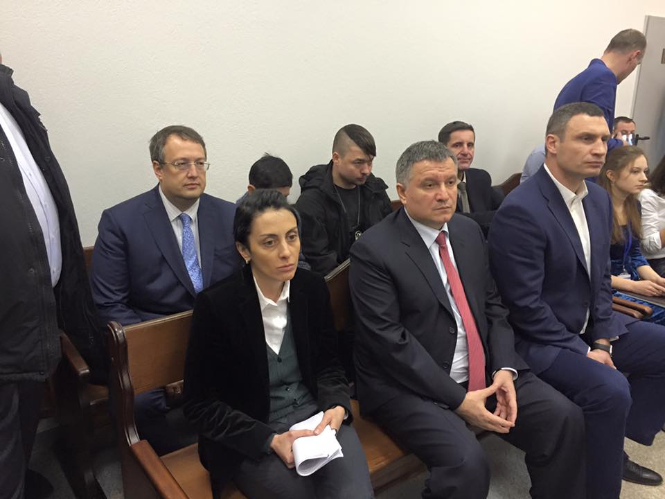 Поддержать Сергея Олийника в зал суда приехали Министр МВД Арсен Аваков, Начальник Национальной полиции Хатия Деканоидзе, мэр Киева Виталий Кличко.
