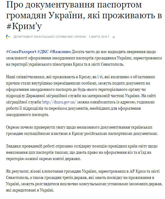 В сообщении, опубликованном на странице департамента консульской службы МИД Украины в Facebook, говорится: «Благодаря проведенной работе получена солидарная позиция ведущих стран мира относительно непризнания этих паспортов, дающими право на оформление виз и въезд на территорию каждого отдельно взятого государства».