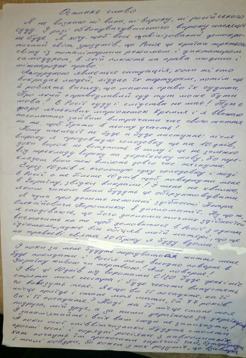 Поэтому апелляции не будет, а будет следующее: после приговора я продолжаю голодовку еще на десять дней, пока приговор вступит в силу, и это независимо от перевода на украинский язык, потому что им они тоже умеют очень долго тянуть время. Через десять дней я объявляю сухую голодовку, и тогда у России есть не более десяти дней, чтобы возвратить меня в Украину, откуда похитили! И меня не волнует каким образом они будут это обосновывать! Я слышала о довольно неплохих способностях Петра Алексеевича Порошенко в дипломатии. Я надеюсь, что его дипломатических способностей хватит на то, чтобы договориться в России с одним идиотом, ведь он обещал моей матери, что я еще на майские праздники 2015 года буду дома.