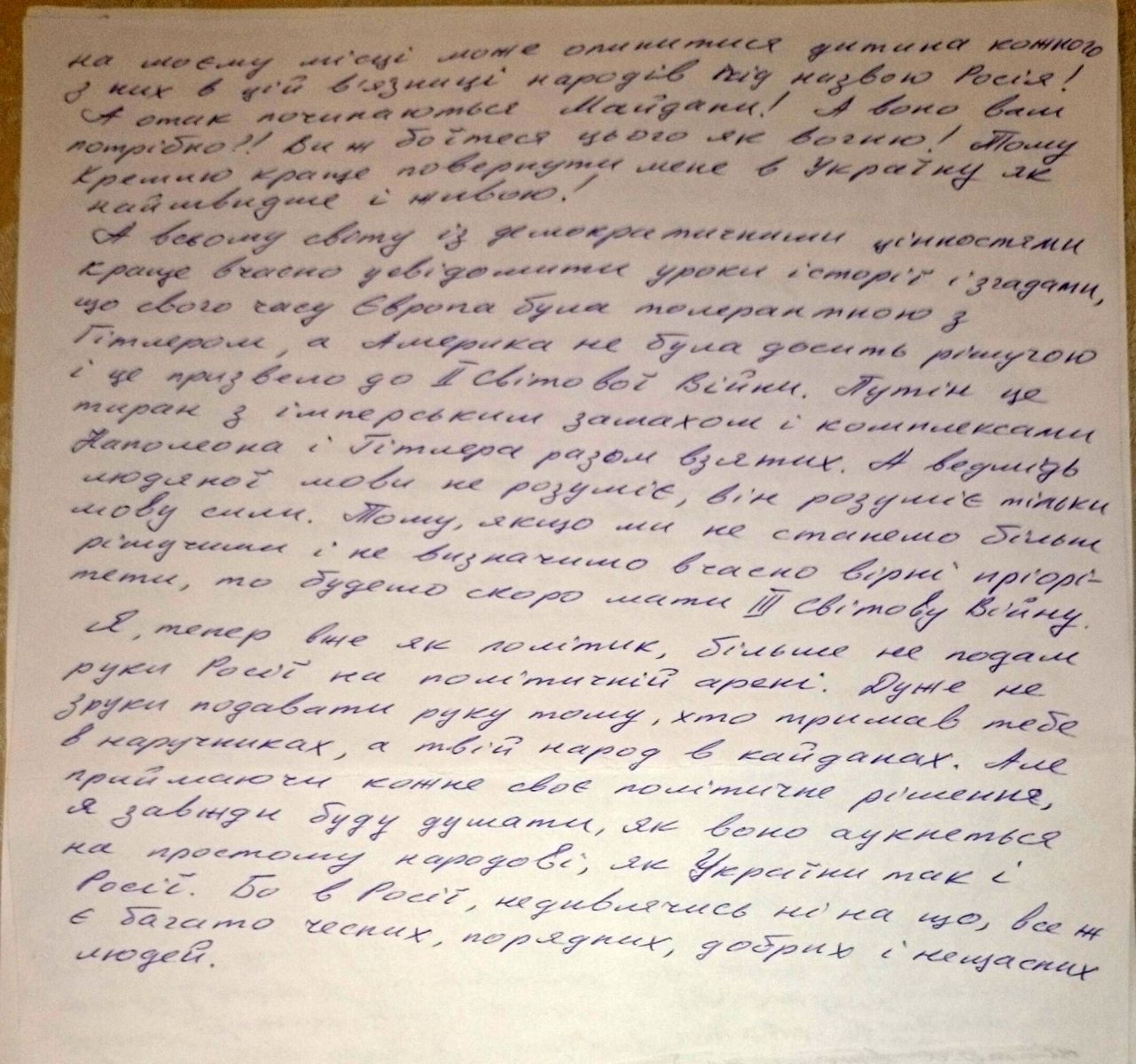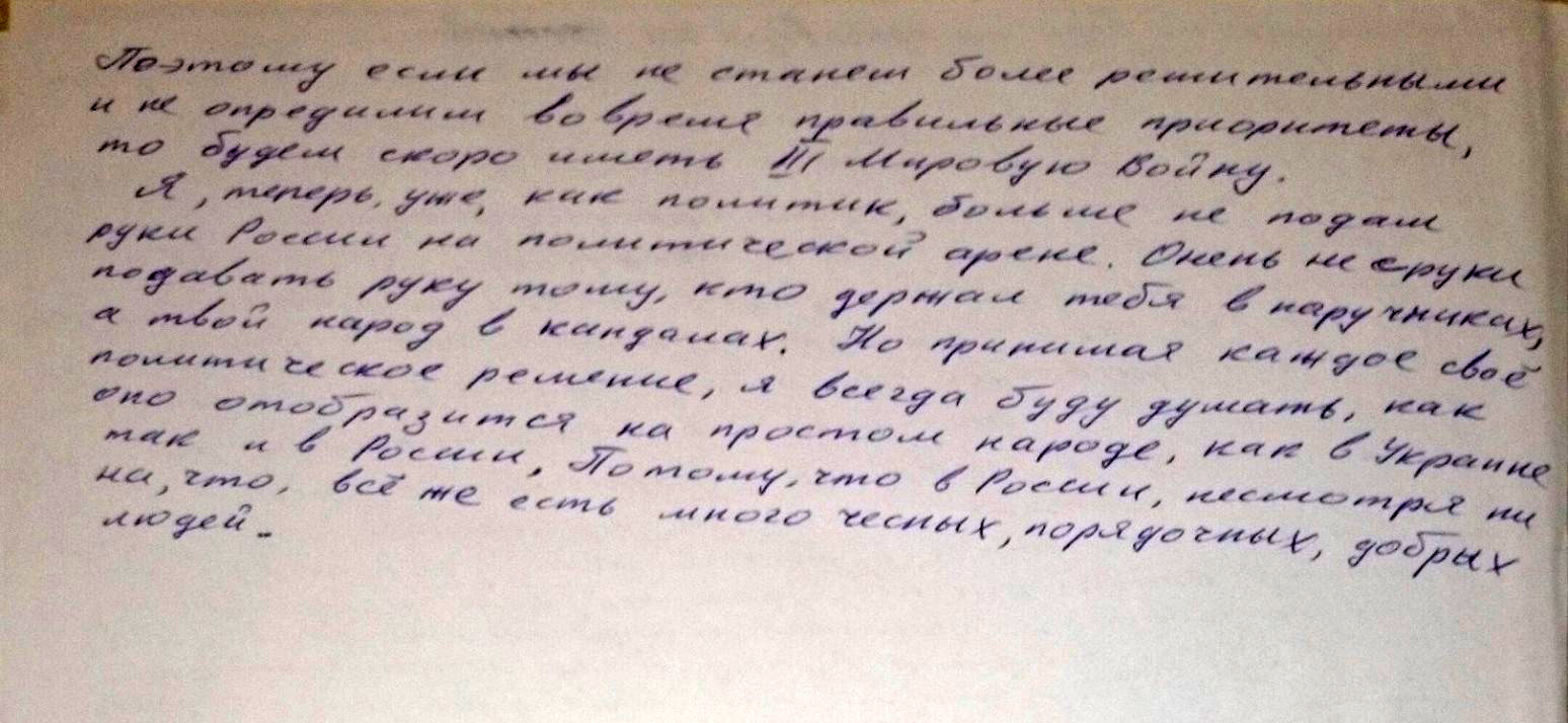 И я, теперь уже как политик не подам руки России на политической арене. Очень не с руки подавать руку тому, кто держал тебя в наручниках, а твой народ в кандалах. Но принимая каждое свое политическое решение, я всегда буду думать, как оно отобразится на простом народе, как в Украине, так и в России. Потому что в России, несмотря ни на что, все же есть много честных, добрых и порядочных людей.