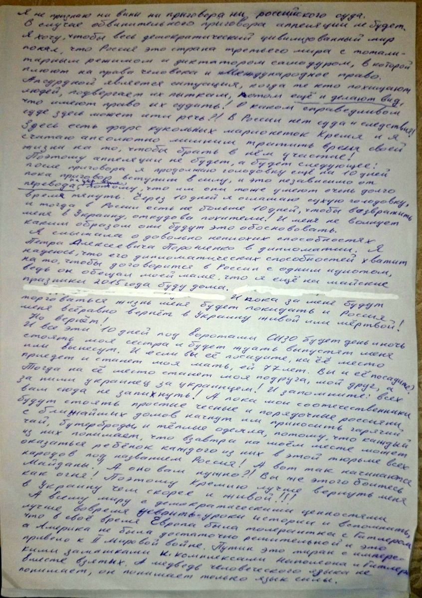 Адвокат Савченко Илья Новиков подтвердил подлинность текста. Публикуем его полностью: