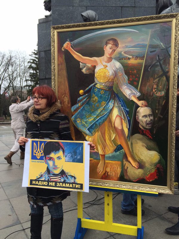 На полотне Надежда Савченко изображена в образе библейской героини Юдифь, которая, по легенде, обезглавила врага и спасла свой народ.