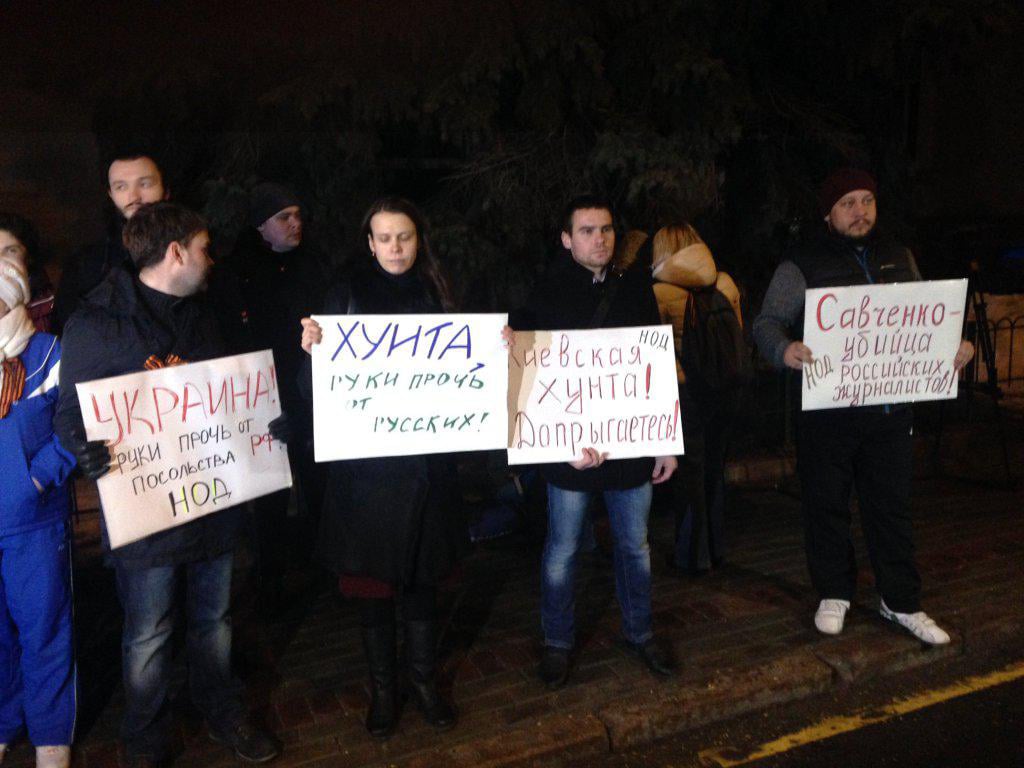 В руках люди держат лозунги "Хунта, руки прочь от русских", "Украина, руки прочь от посольства РФ".