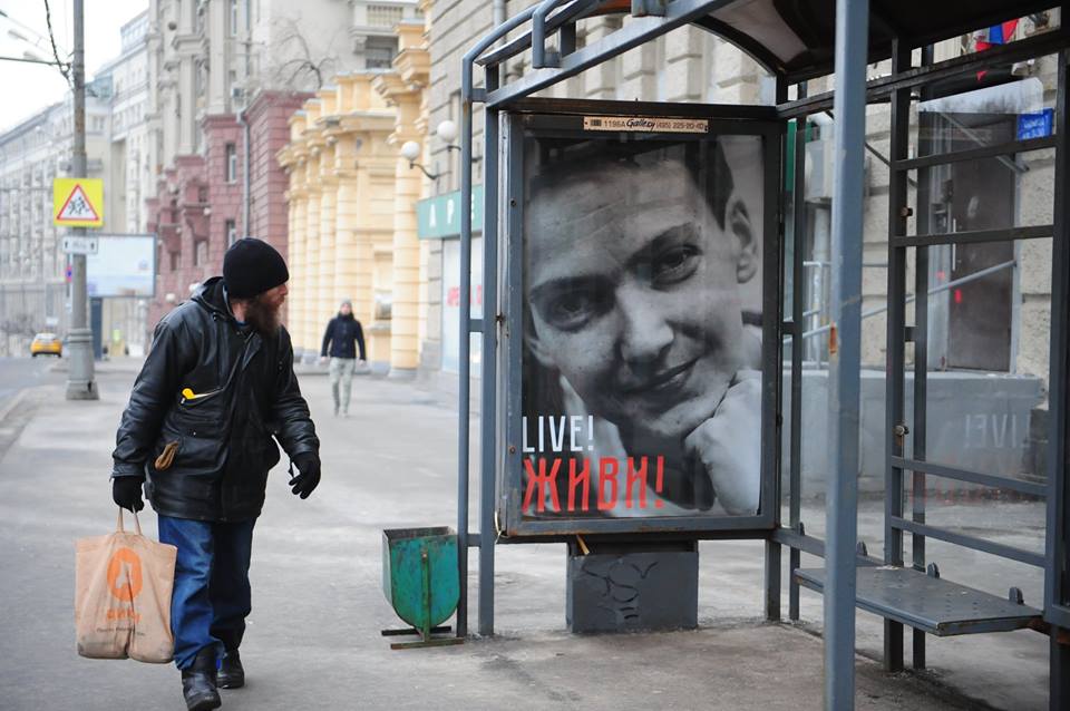 На остановке транспорта на Садовом кольце в Москве появился плакат с портретом народного депутата Украины Надежды Савченко, незаконно удерживаемой в РФ. На плакате сделана надпись "Живи!" на русском и английском языках, информирует Главное.