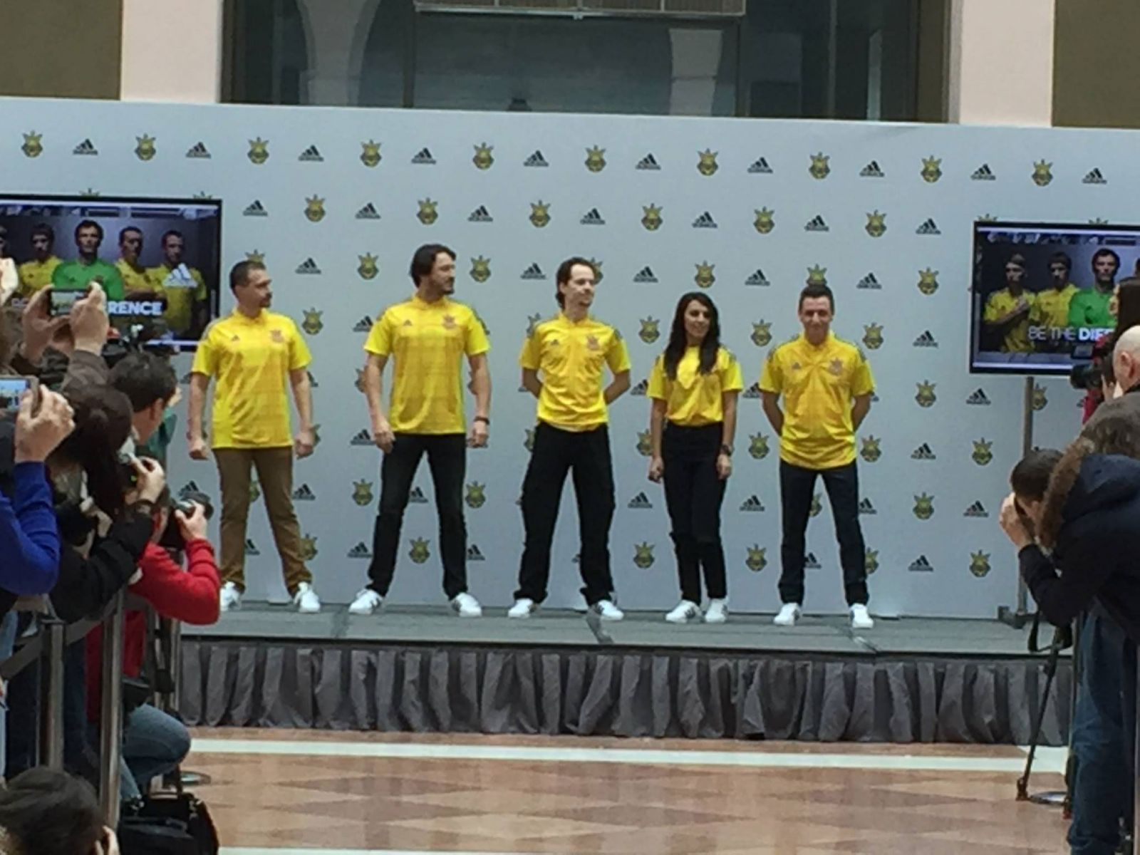 Новая форма представлена в традиционных цветах - желтом и синем. При этом дизайнеры оформили футболки в эксклюзивный орнамент из переплетения нитей, которые образуют клетчатый узор.