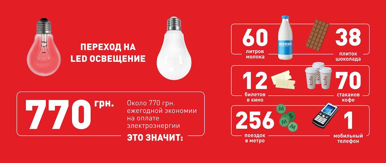 Традиционно, в структуре затрат населения Украины на электроэнергию важное место занимают затраты на освещение. Поэтому, одним из приоритетных направлений экономии в условиях новых тарифов является переход домохозяйств на энергосберегающие светодиодные источники света.