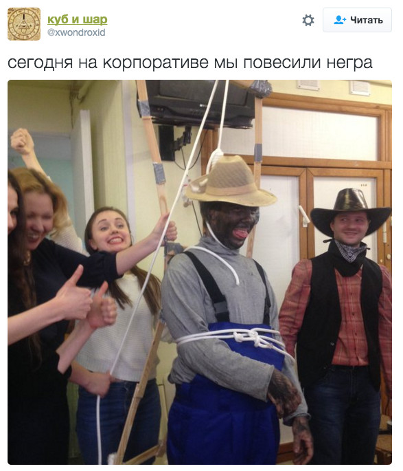 Пользователь Твиттера Анастасия Сторожилова опубликовала фото с корпоратива к 8 марта. На нём сотрудники разыгрывают сценку, в ходе которой «вешают» чернокожего мужчину, пишет Главное со ссылкой на forumdaily.
