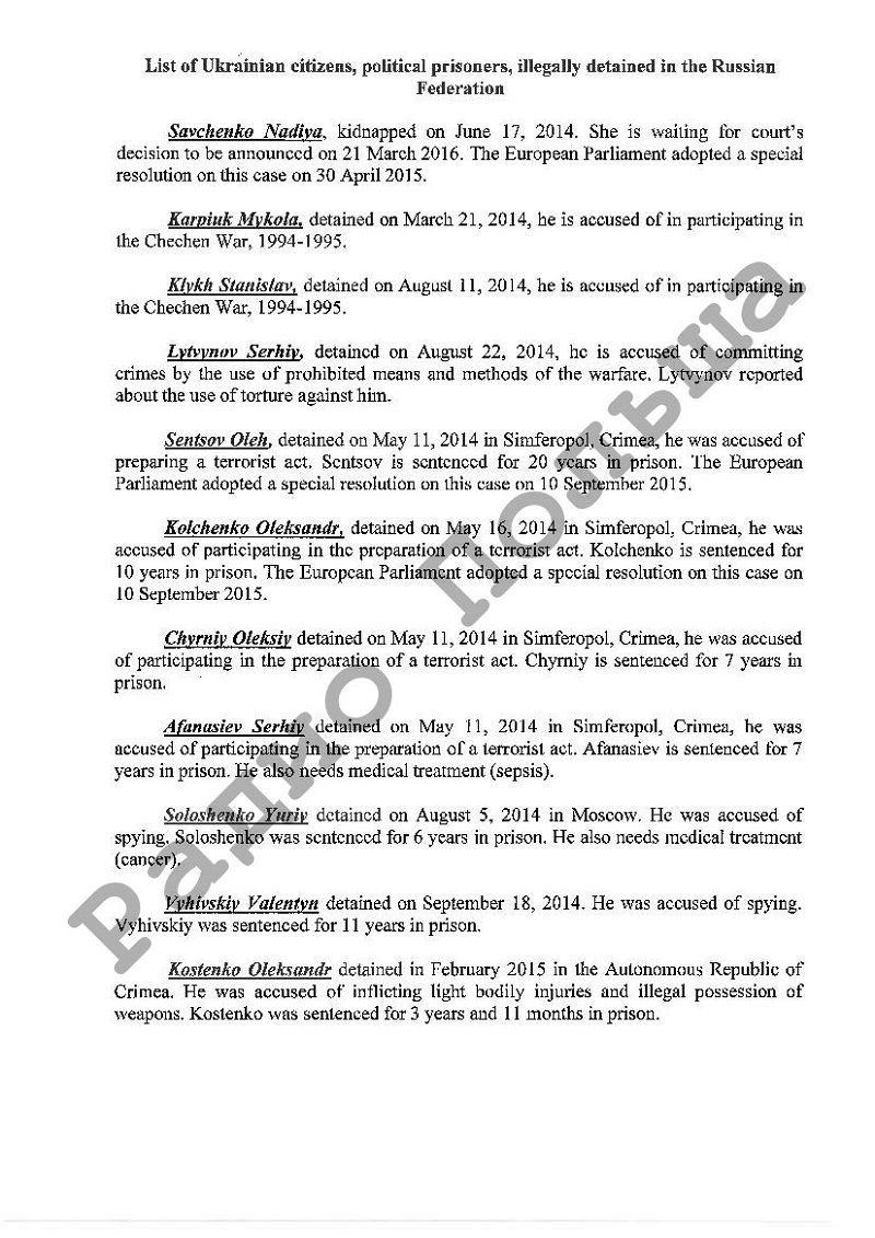 Кроме того, к списку лиц, в отношении которых предлагается ввести санкции, прикреплен перечень «украинских граждан, которых Россия незаконно удерживает на своей территории». Он включает 11 фамилий, среди которых, в частности, Надежда Савченко, Николай Карпюк, Олег Сенцов, Александр Кольченко, Александр Костенко и др.