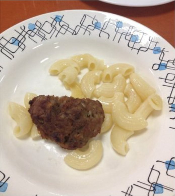 Во «ВКонтакте» один из школьников школы №71 города Рязань разместил фотографию, на которой изображена тарелка с макаронами в количестве 20-ти штук и маленькой котлеткой.
