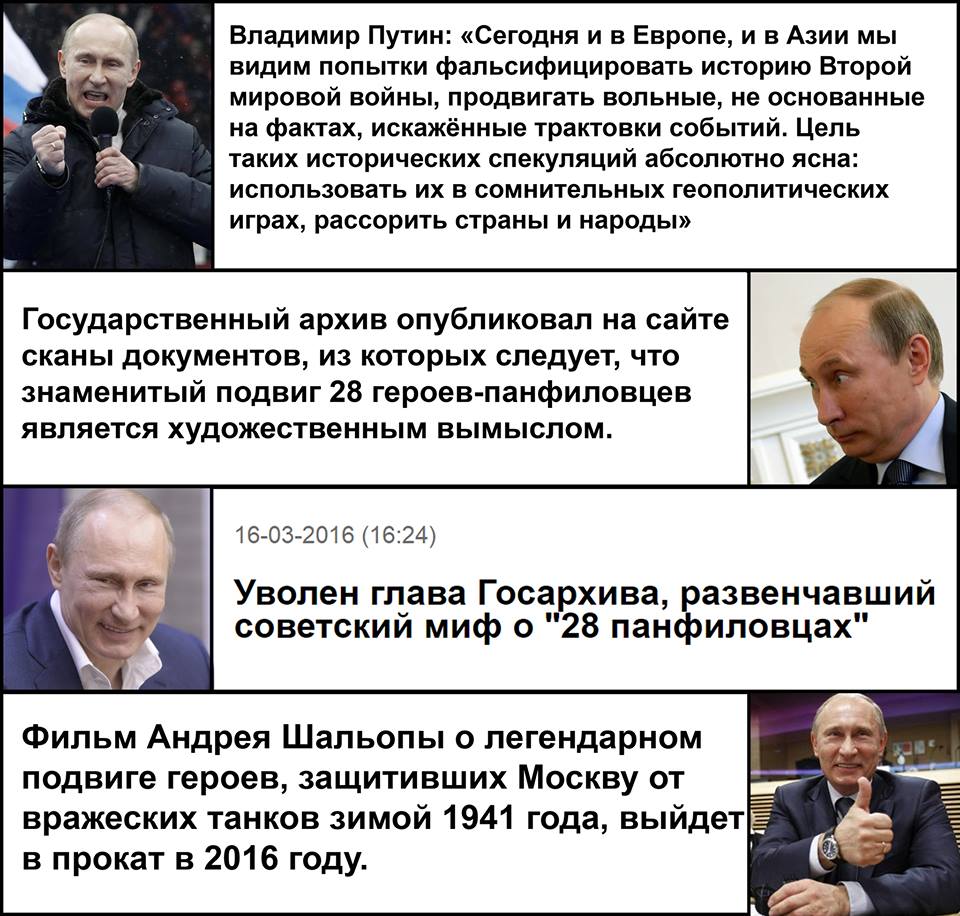 Таким образом в информвойсках отметили, что президент России Владимир Путин ранее заявлял, что на Западе пытаются фальсифицировать исторические факты. Вместе с тем, в РФ главу Госархива уволили после того как этот орган опубликовал документы, согласно которым подвиг "28 панфиловцев" является художественной выдумкой
