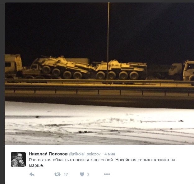 "Ростовская область готовится к посевной. Новейшая сельхозтехника на марше", - иронично подписал фото Полозов, который направляется на суд по делу Савченко, которые в ближайшее время вынесет вердикт по украинской летчице.