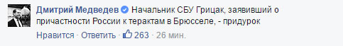 Российский премьер-министр Дмитрий Медведев в своем фейсбуке назвал придурком главу Службы безопасности Украины Василия Грицака, который ранее заявил о возможной причастности России к брюссельским терактам.