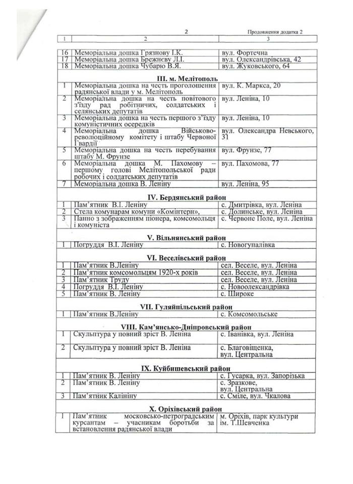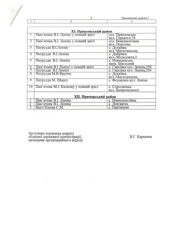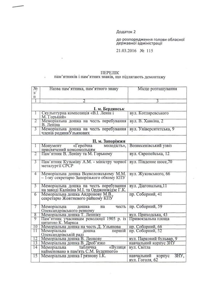Исполняющий обязанности главы Запорожской облгосадминистрации Константин Брыль своим распоряжением обязал местные власти на протяжении месяца, начиная с 21 марта, демонтировать ряд памятников и памятных знаков в Запорожской области,