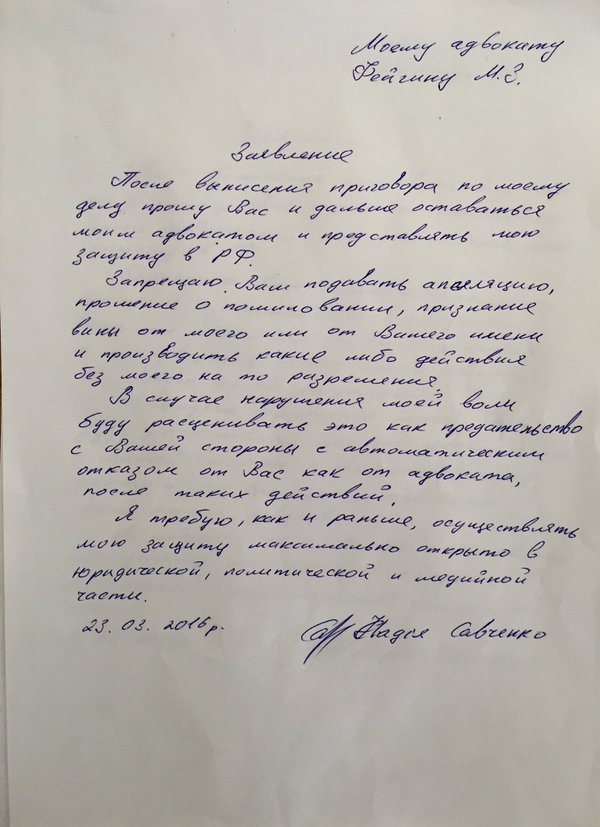 Гражданка Украины Надежда Савченко запретила своим адвокатам обжаловать приговор и подавать прошение о помиловании. Об этом говорится в написанном от руки письме, которое опубликовал в Twitter адвокат Савченко Марк Фейгин, информирует Радио Свобода.