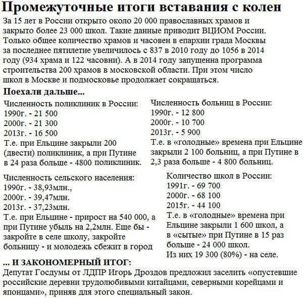 В частности, там говорится, что за последние 20 лет в России открыто 20 000 православных храмов и закрыто 23 000 школ.
