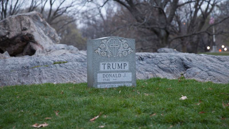 Под именем Трампа на надгробной плите написано "Вернул в Америку ненависть" ("Made America Hate Again"), что является перефразированным слоганом предвыборной кампании Трампа "Вернет Америке величие" ("Make America Great Again").