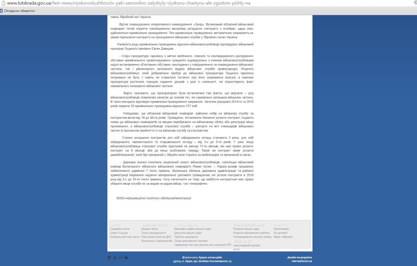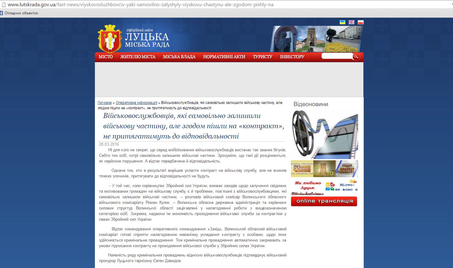«В то время, когда руководство Вооруженный сил Украины, принимает меры по привлечению сознательных и мотивированных граждан на военную службу, есть и проблемы, связанные с военнослужащими, которые самовольно оставили воинские части, - рассказал военный комиссар Волынского областного военного комиссариата Роман Кулик. - Волынская областная государственная администрация и руководители силовых структур Волынской области заинтересованы в налаживании работы с вышеуказанной категорией лиц. В частности, предоставляя им возможность прохождения военной службы по контракту в Вооруженных Силах Украины».