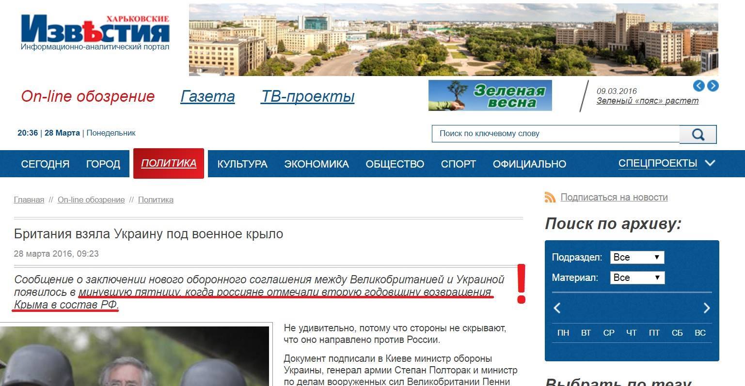 В частности, «Харьковские известия» рассказали читателям, что "оборонное соглашение между Великобританией и Украиной появилось в минувшую пятницу, когда россияне отмечали вторую годовщину возвращения Крыма в состав РФ".
