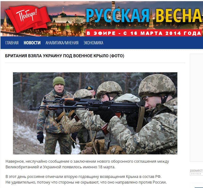 Сегодня на этом сайте в рубрике «мир», где публикуются международные новости, появился замечательный материал: «Британия взяла Украину под военное крыло». И вот уже в самом начале, в подводке к основному материалу, мы читаем: «Сообщение о заключении нового оборонного соглашения между Великобританией и Украиной появилось в минувшую пятницу, когда россияне отмечали вторую годовщину возвращения Крыма в состав РФ.»