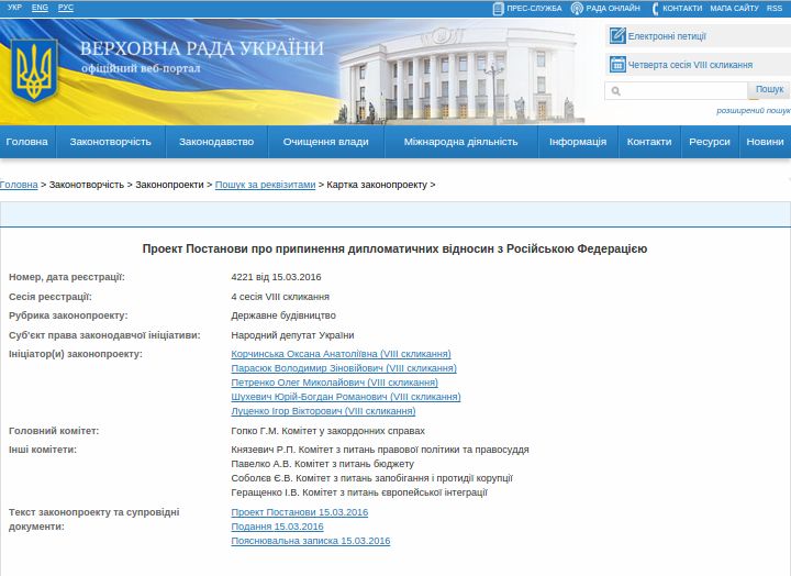 Комитет Верховной Рады по иностранным делам инициирует прекратить дипломатические отношения с Российской Федерацией. Проект постановления опубликован на сайте Верховной Рады.