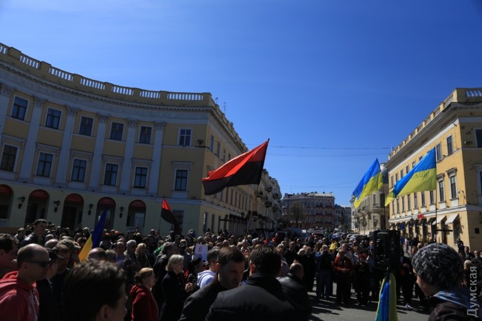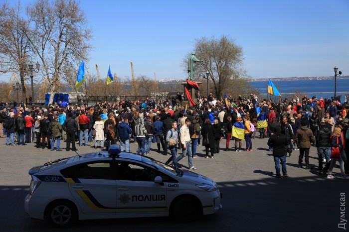 Около трехсот активистов патриотических организаций Одессы, протестующих против назначения прокурором области Николая Стоянова и смещения Сакварелидзе, собрались сегодня возле памятника Дюку.