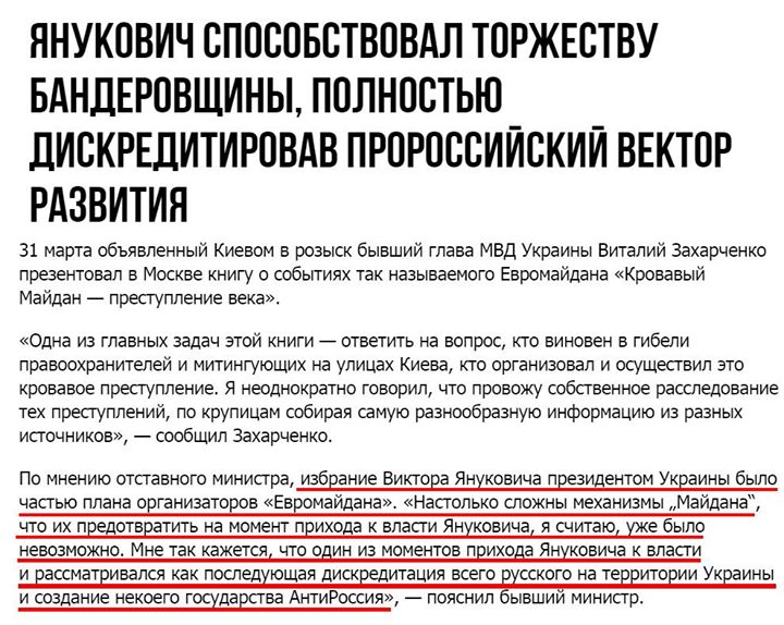Во время презентации своей книги “Кровавый Майдан - преступление века” в Москве, Захарченко заявил, что приход Януковича к власти “рассматривался как последующая дискредитация всего русского на территории Украины”.