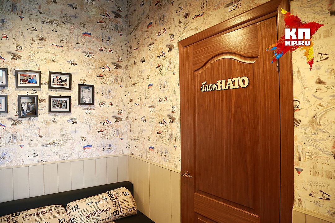 Туалет в кафе подписан "Блок НАТО", там висят портреты канцлера Германии Ангелы Меркель, президента Украины Петра Порошенко, мэра Киева Виталия Кличко, лидера "Батьківщини" Юлии Тимошенко. В уборной лежит маркер, и каждый желающий может "покреативить" с портретами. Чаще всего дорисовывают усы или пишут матерные слова, отмечает администрация кафе.