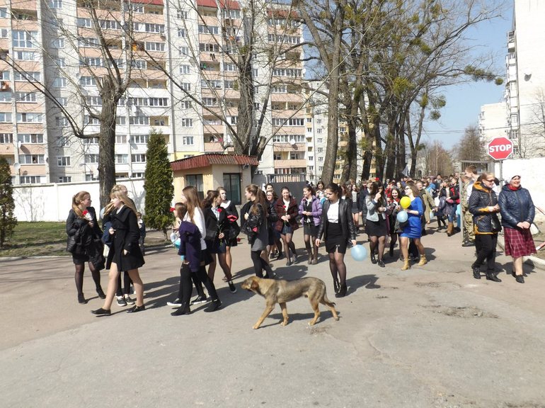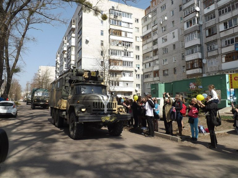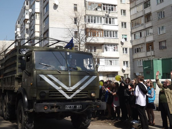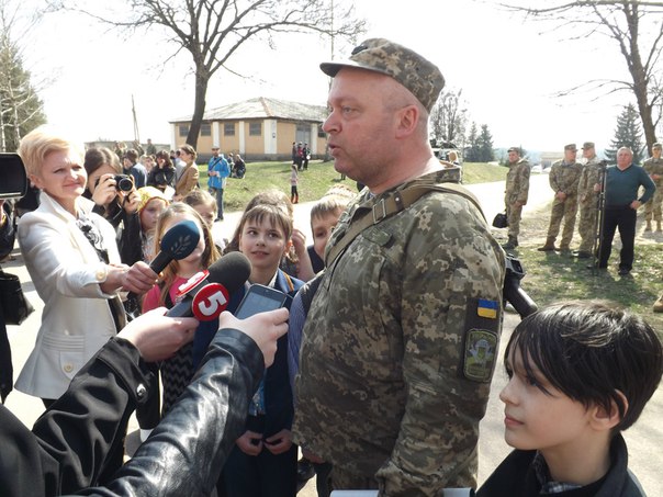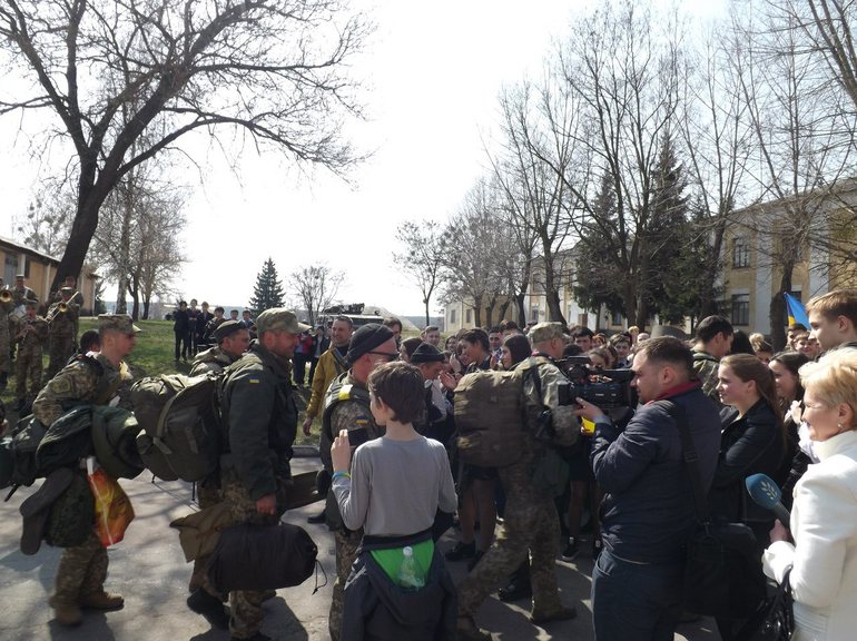 После обеда 6 апреля посмотреть и поздравить с возвращением героев пришли ученики нескольких школ. Учителя, которые привели детишек из школы «Всесвіт», рассказывают, что у многих учеников родители также выполняют боевые задачи на Востоке или уже вернулись оттуда.