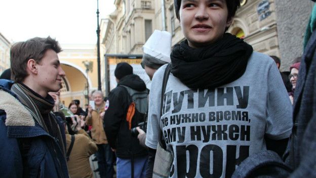 Некоторые приходили в футболках с перечеркнутым изображением президента и с надписью "Путину не нужно время, ему нужен срок".