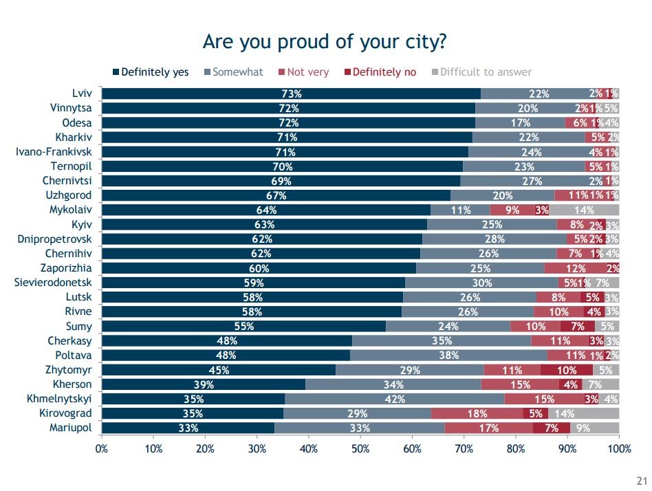 За даними опитування, найбільше своїм містом пишаються львів’яни (73%), вінничани (72%), одесити (72%), харків’яни (71%), іванофранківці (71%) й тернополяни (70%). 63% киян також задоволені своїм містом. Найменше — жителі Маріуполя (33%), Хмельницького (35%), Кіровограда (35%) і Херсона (39%).