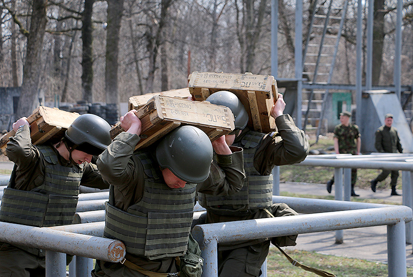 На первом этапе команды преодолевали полосу препятствий. Гвардейцы проходили дистанцию в 200 метров, в полной выкладке и с патронными ящиками, преодолевая все препятствия на пути: ров, забор, лестницы и прочее.