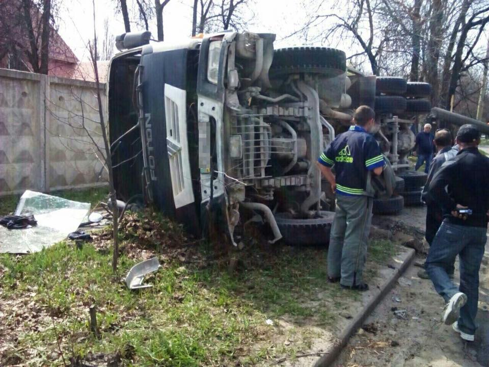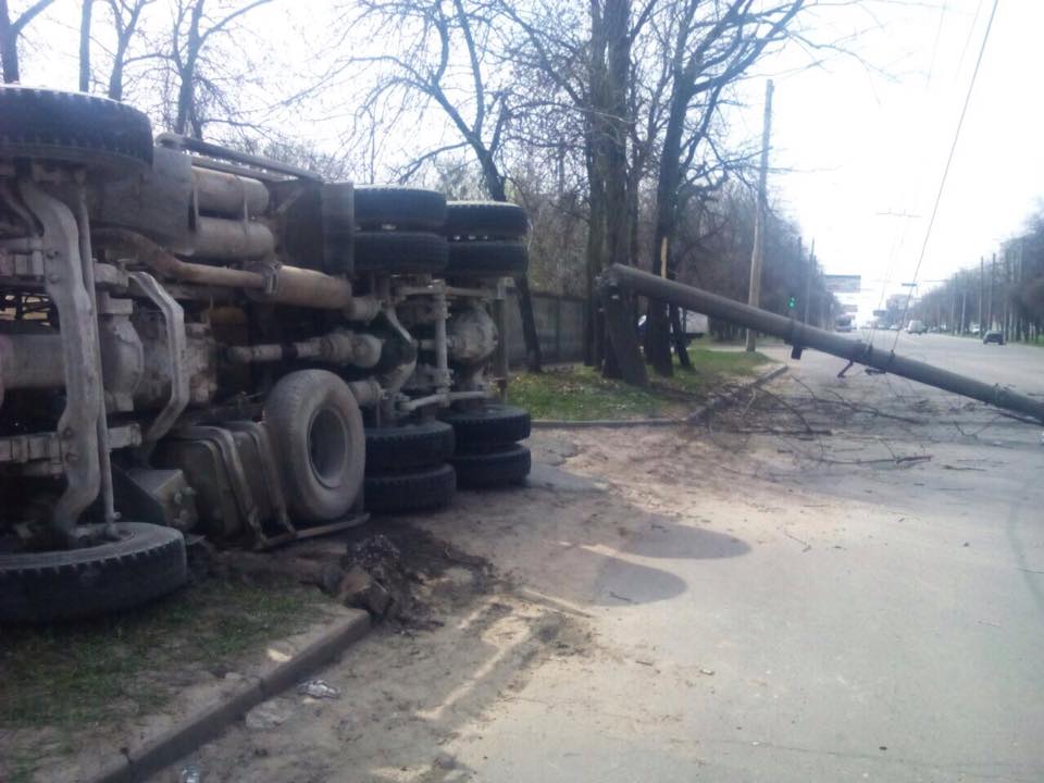 По предварительным данным, автомобиль "Фотон" двигался по улице Харьковских Дивизий и совершал поворот на улицу Героев Сталинграда на большой скорости. Водитель не справился с управлением, и грузовик перевернулся на бок, после чего сбил электроопору.