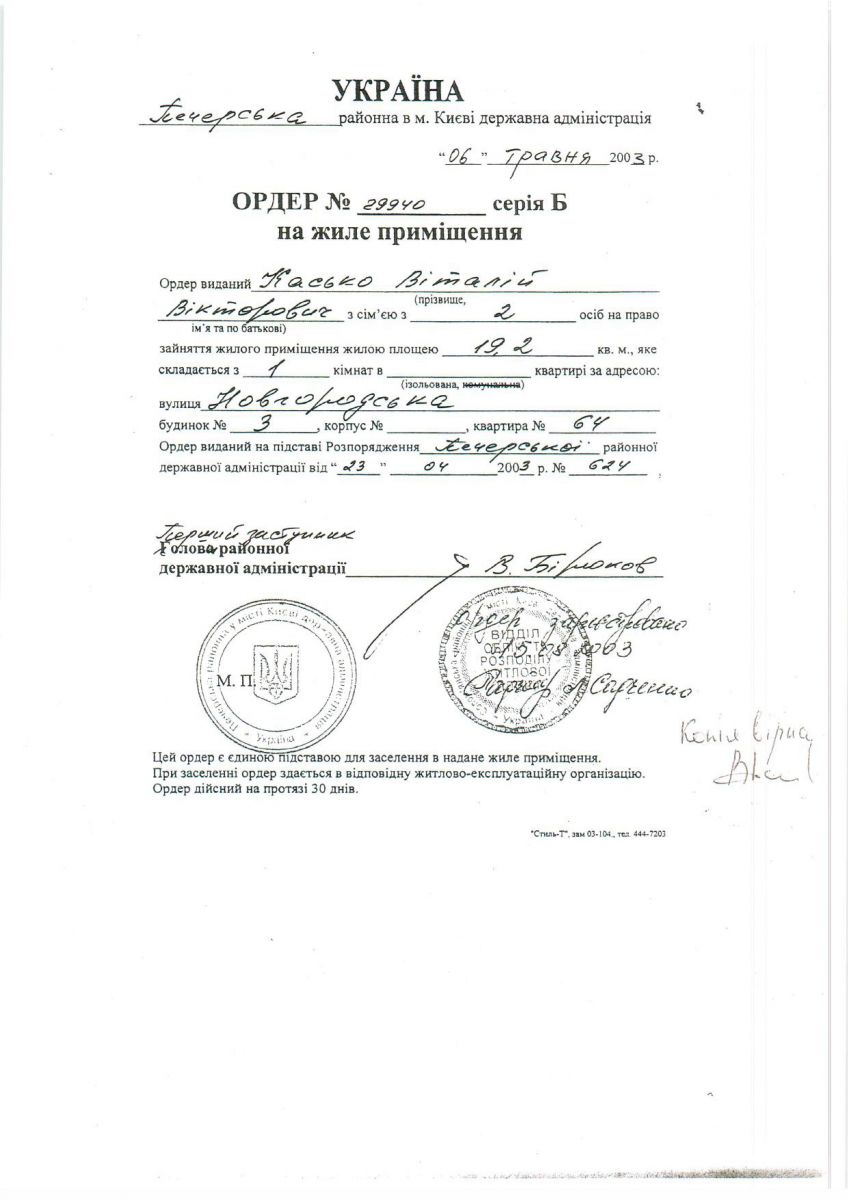 Печерською районною в м. Києві державною адміністрацією 06.05.2003 видано ордер № 29940, серії Б