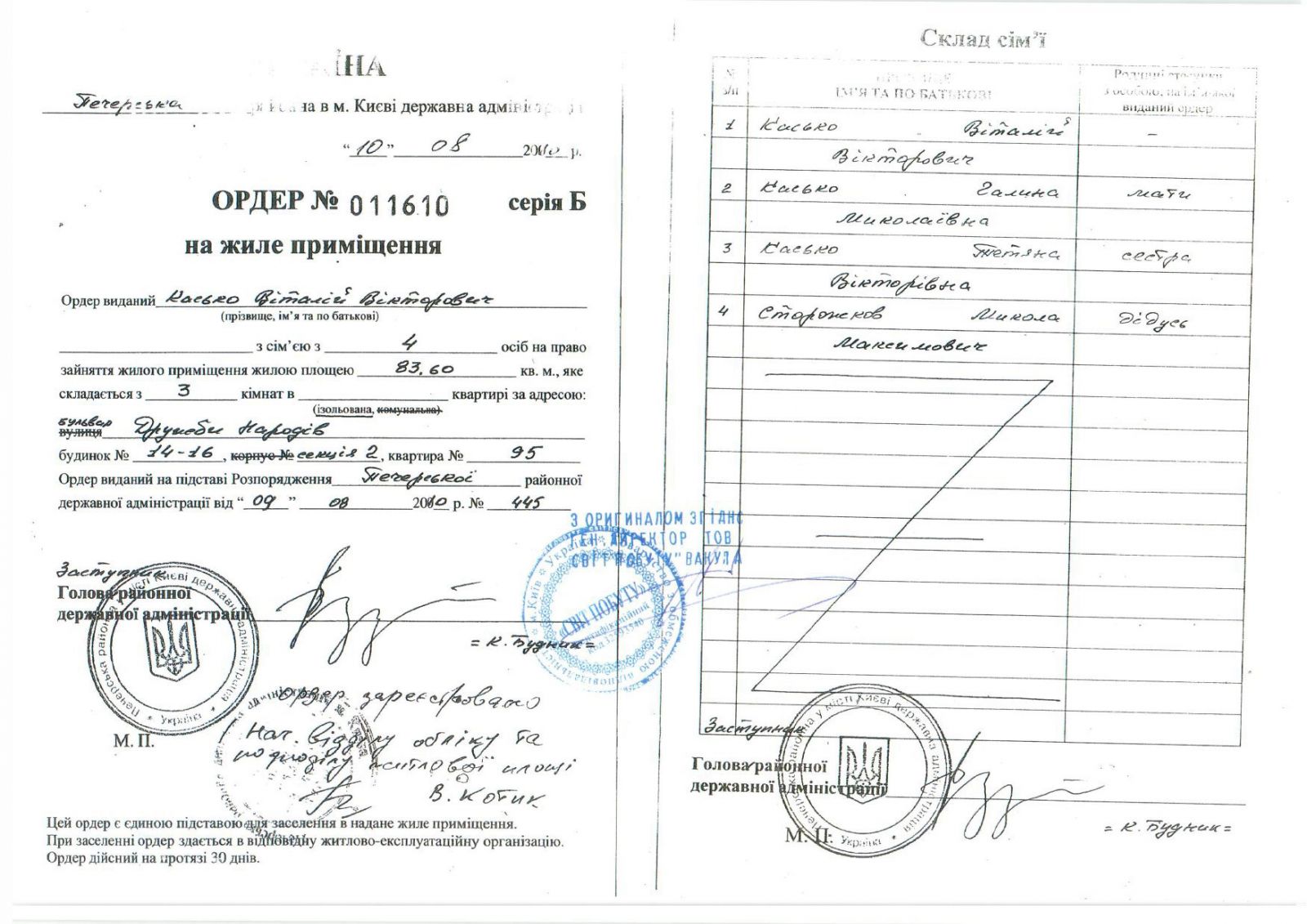 Печерською районною в м. Києві державною адміністрацією 10.08.2010 видано ордер № 011610, серії Б