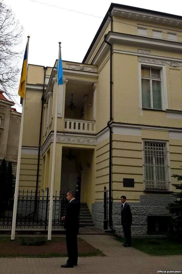 Пресс-служба уполномоченного президента Украины по делам крымских татар Мустафы Джемилева опубликовала фото крымскотатарского флага, который подняли на флагштоке посольства Украины в Литве рядом с украинским флагом.