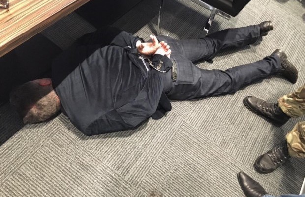 В свою очередь прокуратура Киевской области опубликовала фотографии задержания, на которых в кабинете висит флаг Вышгорода.