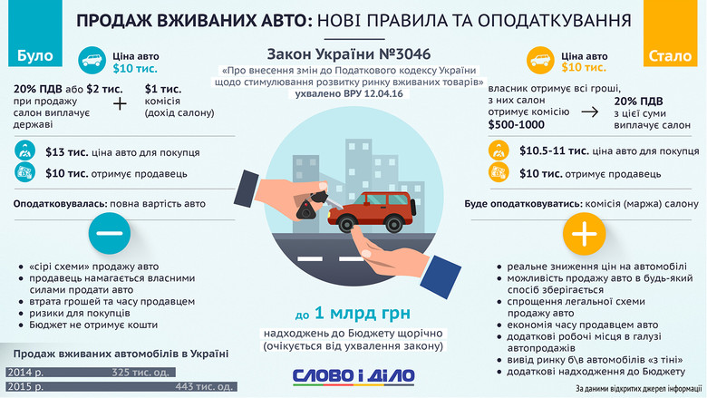 Если взять условную цены б/у автомобиля в размере $10 тыс., то по старым правилам покупатель заплатил бы дополнительно еще $3 тыс. Полная же стоимость авто составила бы $13 тыс. По новым правилам налогообложения, при сохранении условной цены авто покупатель заплатит налогов только $0,5-$1 тыс. в зависимости от условий покупки, что выльется в конечную цену авто не более $11 тыс.