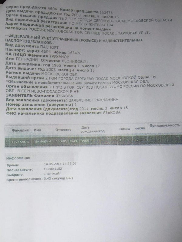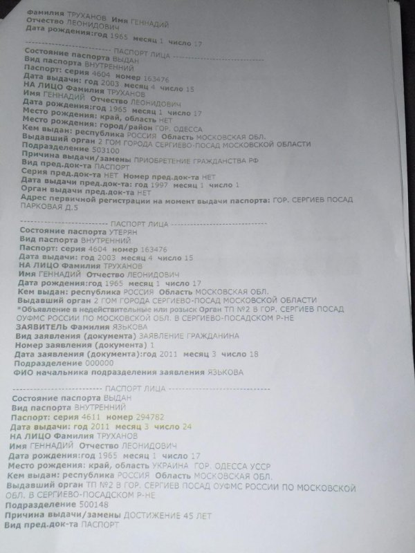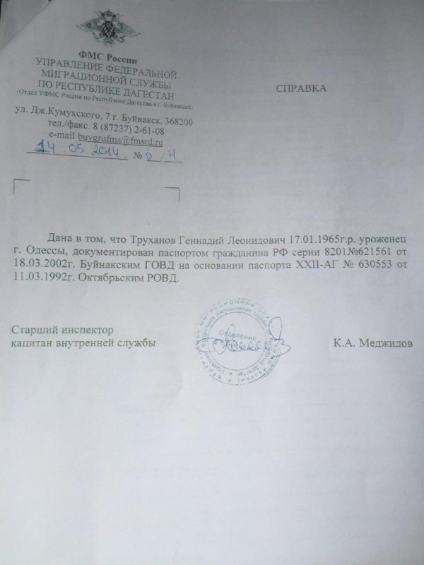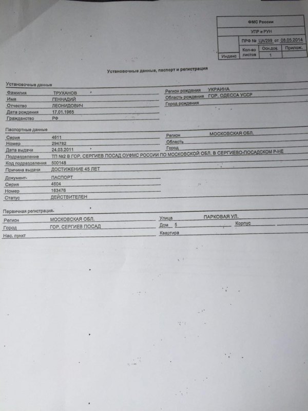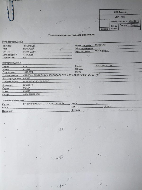 Если СБУ не умеет работать, я им помогу. Ниже представлены документы, которые неопровержимо доказывают факт российского гражданства Геннадия Труханова. У мэра Одессы, исходя из документов, есть даже 2 российских паспорта, один выдан в Московской области, а другой в Дагестане. Так что после Донецка, кадыровцы вполне возможно "приедут освобождать" Одессу. Труханов якобы терял паспорт, это послужило причиной получения нового.