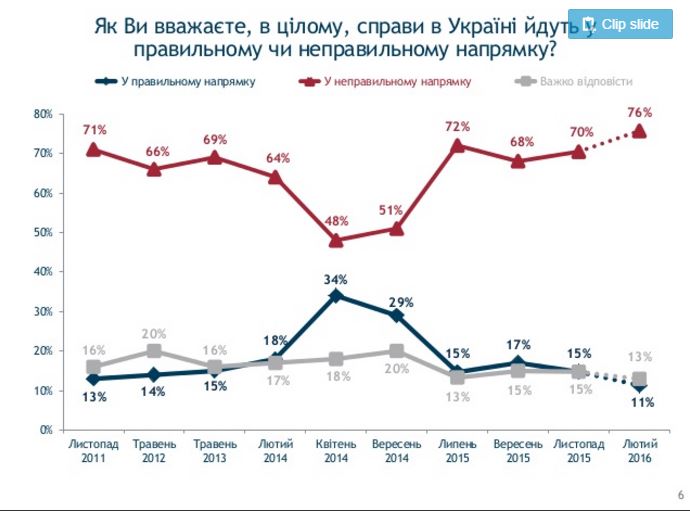 Большинство украинцев (76%) считает, что наша страна движется в неправильном направлении. Об этом свидетельствуют данные социологического исследования, проведенного группой "Рейтинг" по заказу Международного Республиканского Института.